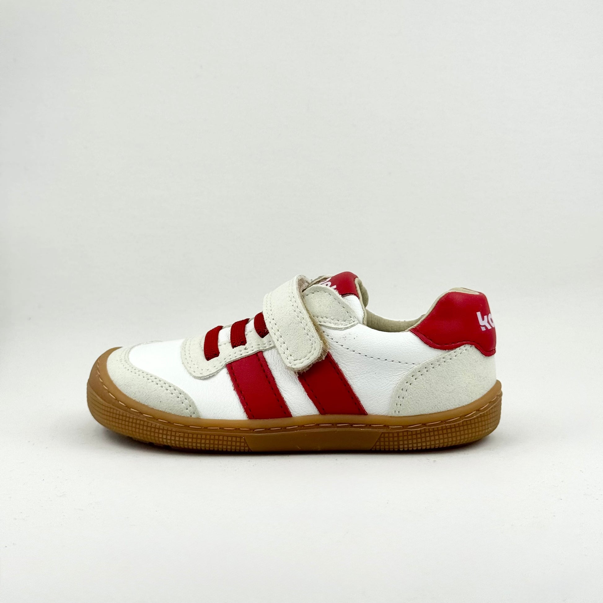 A casual white sneakers with a pop of color, designed with a barefoot shape, wide toe-box and low profile, elastic laces and velcro strap and Bernardino based sole.